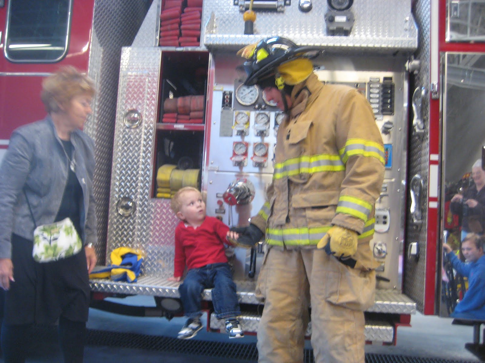 He was a little wary of when the fireman got all dressed up in his digs (but this was the point of the excursion, to get little ones used to seeing them like this and know they're friendly):